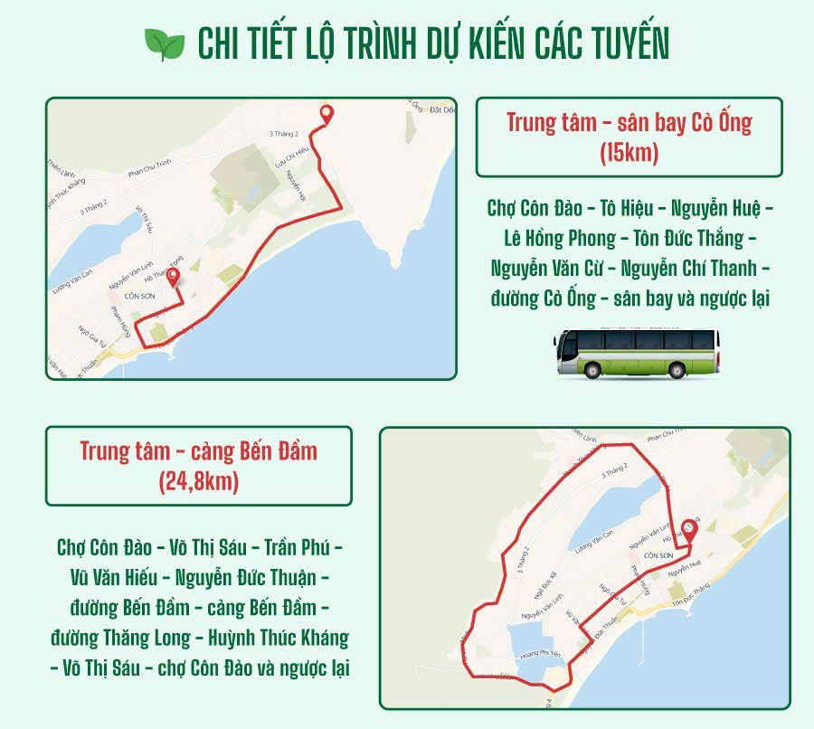 Trung tâm Quản lý giao thông công cộng Côn Đảo đề xuất 6 tuyến xe buýt điện hoạt động tại đặc khu Côn Đảo đáp ứng nhu cầu đi lại của người dân và bảo vệ môi trường. Mục tiêu tới năm 2030 đạt chuẩn khí thải 100% và giảm 57% các phương tiện gắn máy sang xe điện thân thiện môi trường.