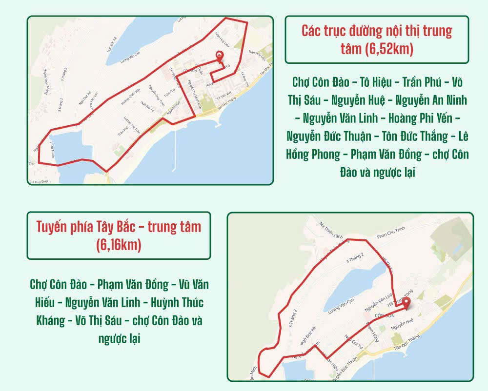3. Các trục đường nội thị trung tâm (6,52km): Chợ Côn Đảo - Tô Hiệu - Trần Phú - Võ Thị Sáu - Nguyễn Huệ - Nguyễn An Ninh - Nguyễn Văn Linh - Hoàng Phi Yến - Nguyễn Đức Thuận - Tôn Đức Thắng - Lê Hồng Phong - Phạm Văn Đồng - chợ Côn Đảo và ngược lại.
