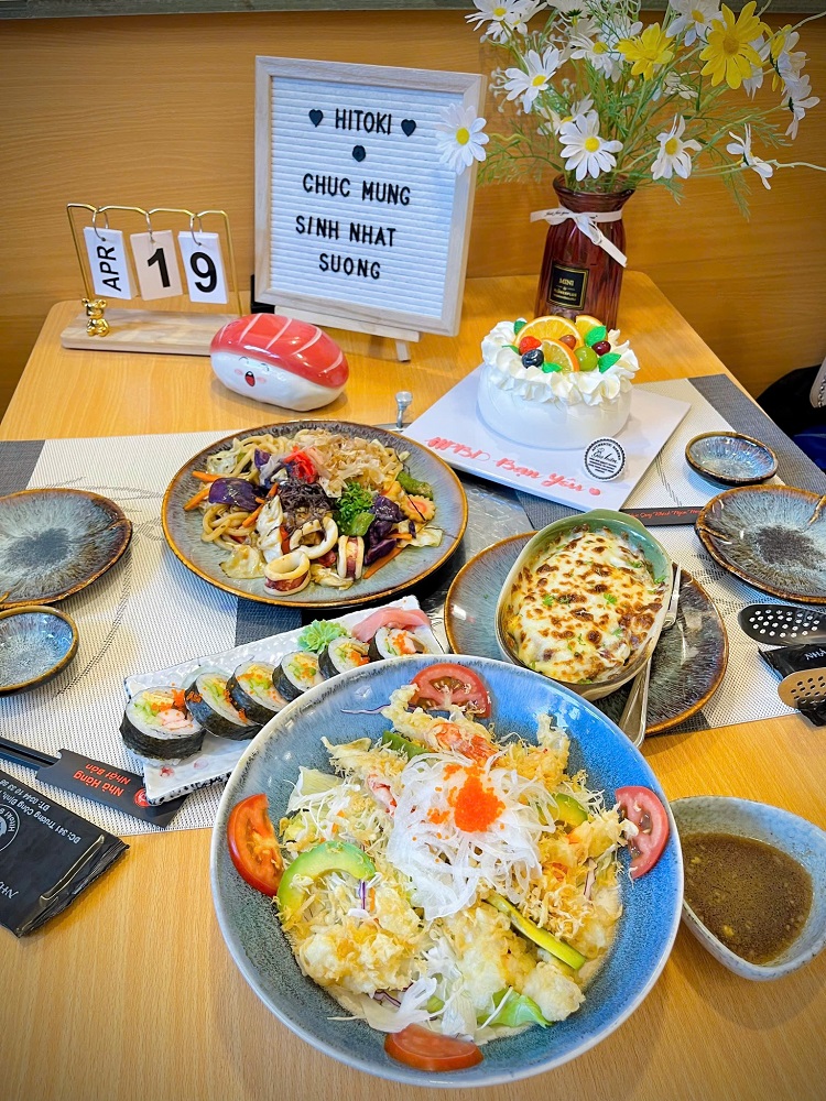Tổ chức sinh nhật tại HitokiSushi được chế biến từ hải sản tươi sốngMón ăn được trang trí hấp dẫnĐồ ăn kèm nước uốngCác món chín ăn kèm salad tại HitokiThực đơn đa dạng các món Nhật tại HitokiThực khách có nhiều lựa chọn khi ăn uống tại Hitoki